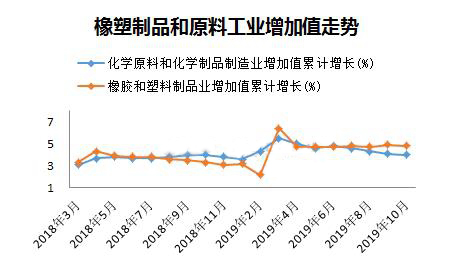 1-10月份,化學原料和化學品制造業增加值同比增長4%,橡膠和塑料制品業增加值同比增長4.8%,年內兩者呈現持續下降態勢。兩者增速差與上月持平,較前幾個月有所擴大,表明原料端價格下降支撐了終端產出增速。塑料制品業工業增加值無論同比還是累計同比,數據均略高于去年同期,表明塑料下游行業好于塑料原料。