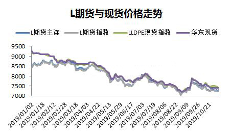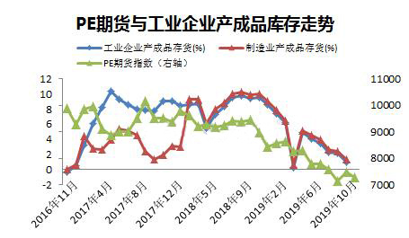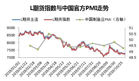 2019年月初以來價(jià)格數(shù)據(jù)顯示,PE期貨和現(xiàn)貨相關(guān)度極高,幾乎同步漲跌,因此以下的分析,取期貨價(jià)格指數(shù)跟宏觀指標(biāo)對比。