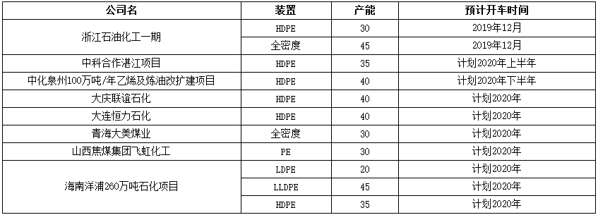 2019年年內(nèi)中安聯(lián)合35萬噸LLDPE裝置已經(jīng)于7月30日開車生產(chǎn),寧夏寶豐二期30萬噸HDPE裝置已經(jīng)于9月27日投料生產(chǎn),算上初步計劃四季度投產(chǎn)的浙江石化來說,截止2020那邊預(yù)期投產(chǎn)裝置初步預(yù)計為390萬噸。