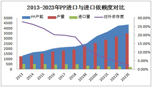 分析原因:一、國內產能集中,尤其煤化、PDH、MTO不同原料產能激增,不斷提升國內產能自給能力;二、同質化產品競爭激烈化,進口呈現兩極分化,均聚進口量逐步減量,高端專用產品進口仍以進口為主;三、國內科研水平不斷提升,專用產品研發提升后,對外依賴度將逐步下降。預計:2019-2023年進口量將會降至200萬噸附近,進口依賴度降至2.23%附近。
