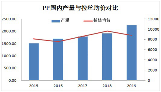 國內PP產量與拉絲均價呈現較為明顯反比趨勢,2016、及2018-2019年表現尤為明顯。2016年國內PP產量經歷了2014-2015年繼續擴張后,年產量高達1695.69萬噸,當年國內拉絲均價由2015年8090元/噸降至7570元/噸,降幅6.43%。2018年是近幾年產能增速相對較慢的一年,受整體擴能放緩且國內大型企業檢修集中支撐,國內拉絲均聚同比2017年漲幅12.7%。2019年1-10月份整體擴能202萬噸,均價同比2018年跌幅8.35%。