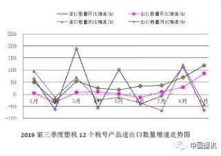 從進出口情況來看,塑機12個稅號產品2019年前三季度進口15350臺,同比下降6%,進口額14.48億美元,同比下降7%;出口1120168臺,同比增長41%,出口額19.37億美元,同比增長7%;貿易順差4.89億美元。