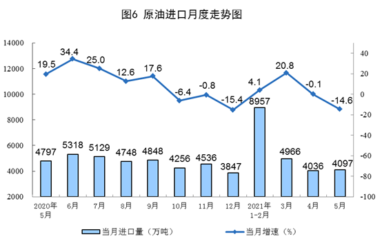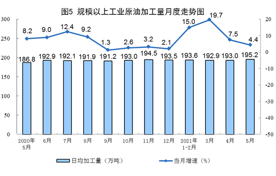 1—5月份,生產原油8265萬噸,同比增長2.2%,比2019年同期增長4.1%,兩年平均增長2.0%;加工原油29274萬噸,同比增長12.0%,比2019年同期增長10.8%,兩年平均增長5.3%。
