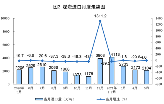 1—5月份,生產原煤16.2億噸,同比增長8.8%,比2019年同期增長9.8%,兩年平均增長4.8%;進口煤炭11117萬噸,同比下降25.2%。