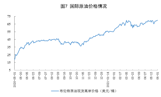 原油進口繼續下降,國際原油價格有所上漲。5月份,進口原油4097萬噸,同比下降14.6%;1—5月份,進口原油22054萬噸,同比增長2.3%。6月1日布倫特原油現貨離岸價格為70.03美元/桶,比4月30日的67.73美元/桶上漲3.4%。