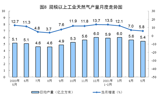 1—5月份,生產天然氣872億立方米,同比增長10.3%,比2019年同期增長21.4%,兩年平均增長10.2%。