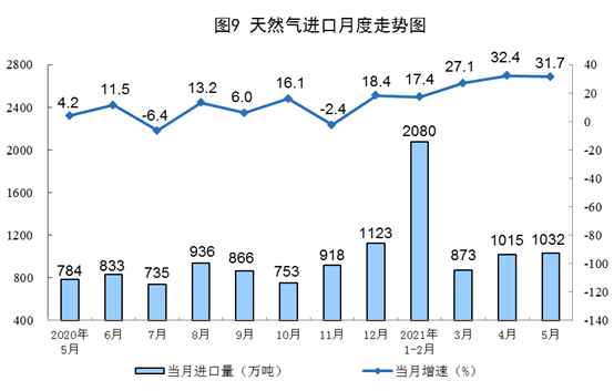 天然氣進口保持較快增長。5月份,進口天然氣1032萬噸,同比增長31.7%。1—5月份,進口天然氣4978萬噸,同比增長24.5%。