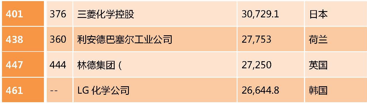 在《財(cái)富》化學(xué)品行業(yè)榜中11家公司上榜,巴斯夫領(lǐng)銜化工行業(yè)榜,位居134位,比上年上升9位;中國(guó)化工集團(tuán)有限公司(161)、浙江榮盛控股集團(tuán)有限公司(255)、浙江恒逸集團(tuán)有限公司(309)、陶氏公司(310)、盛虹控股集團(tuán)有限公司(311)、3M公司(382)、三菱化學(xué)控股(401)、利安德巴賽爾工業(yè)公司(438)、林德集團(tuán)(447)、LG化學(xué)公司(461)。