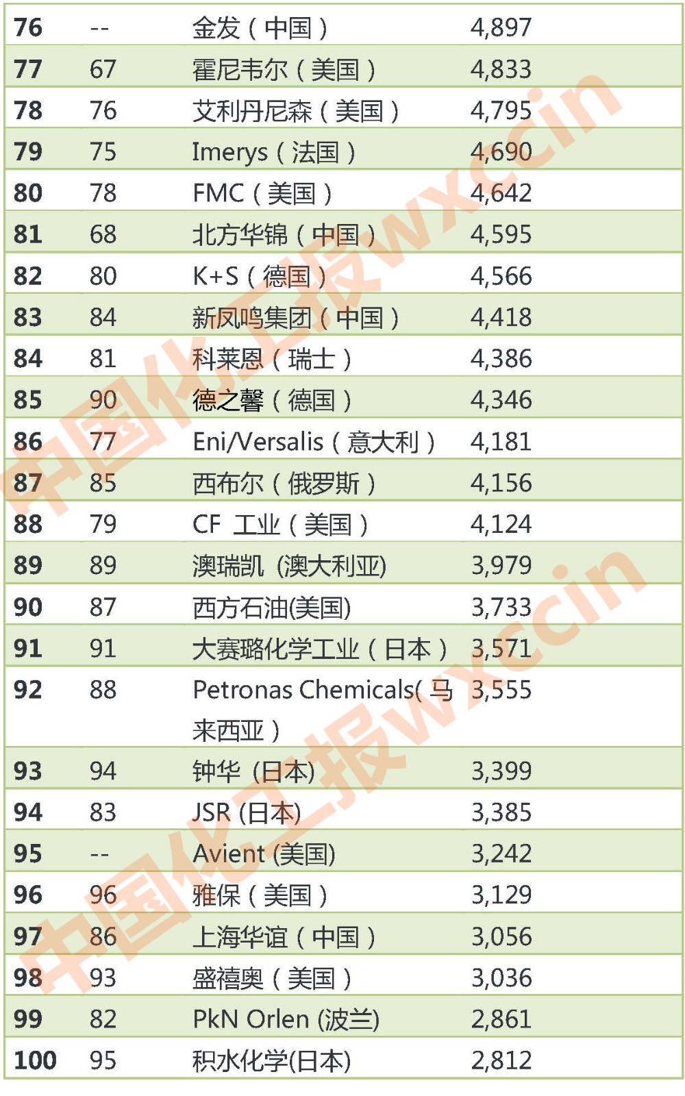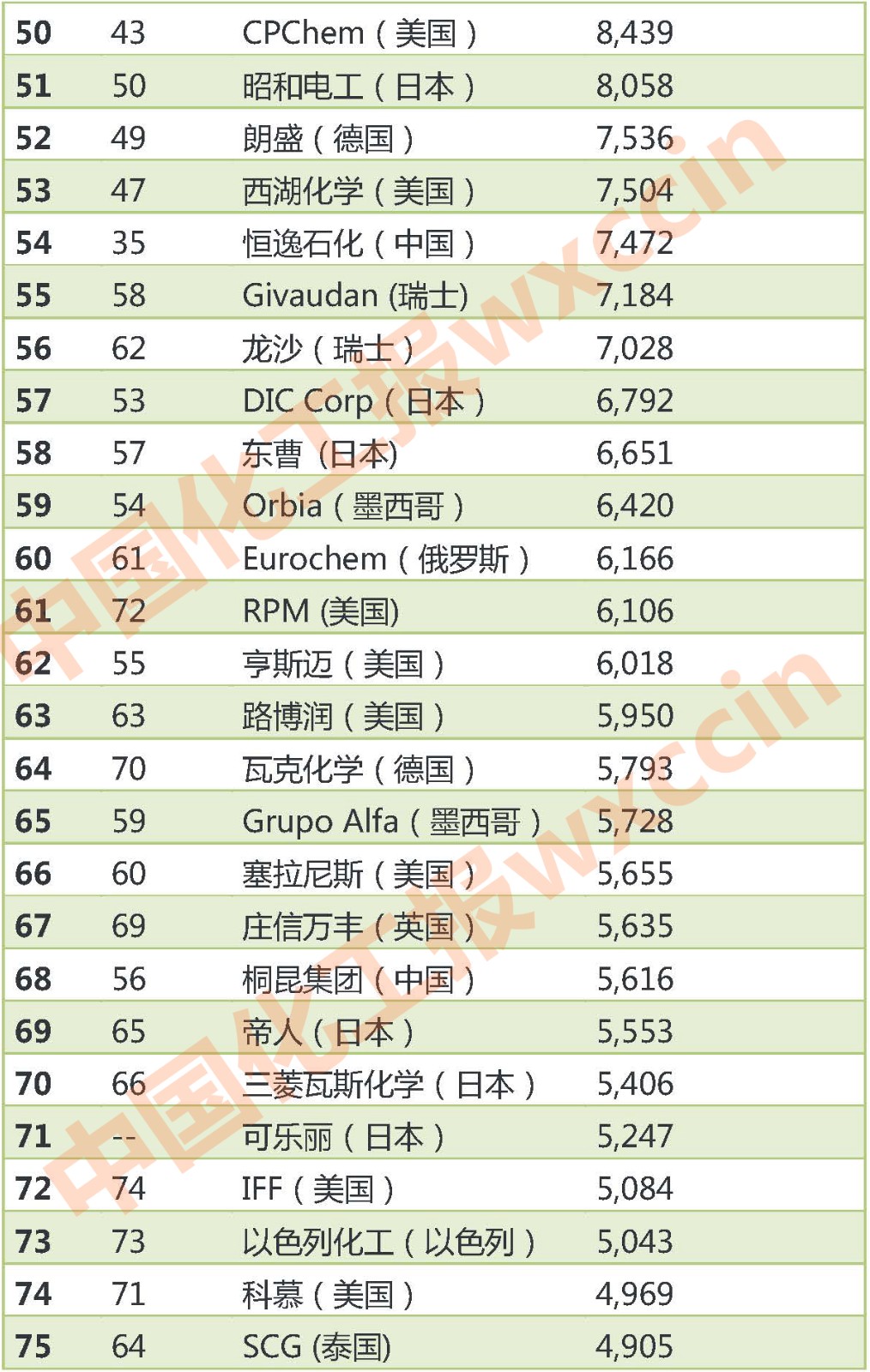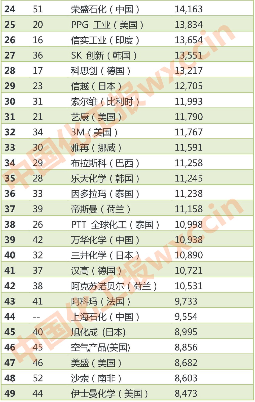 今年十億美元俱樂部排名門檻為28億美元,共有13家中國公司入圍,中國石化位居第2,臺塑集團第4,中國化工第7位,恒力石化大幅上升13名位居第14位,榮盛石化躍升27位至第24名。