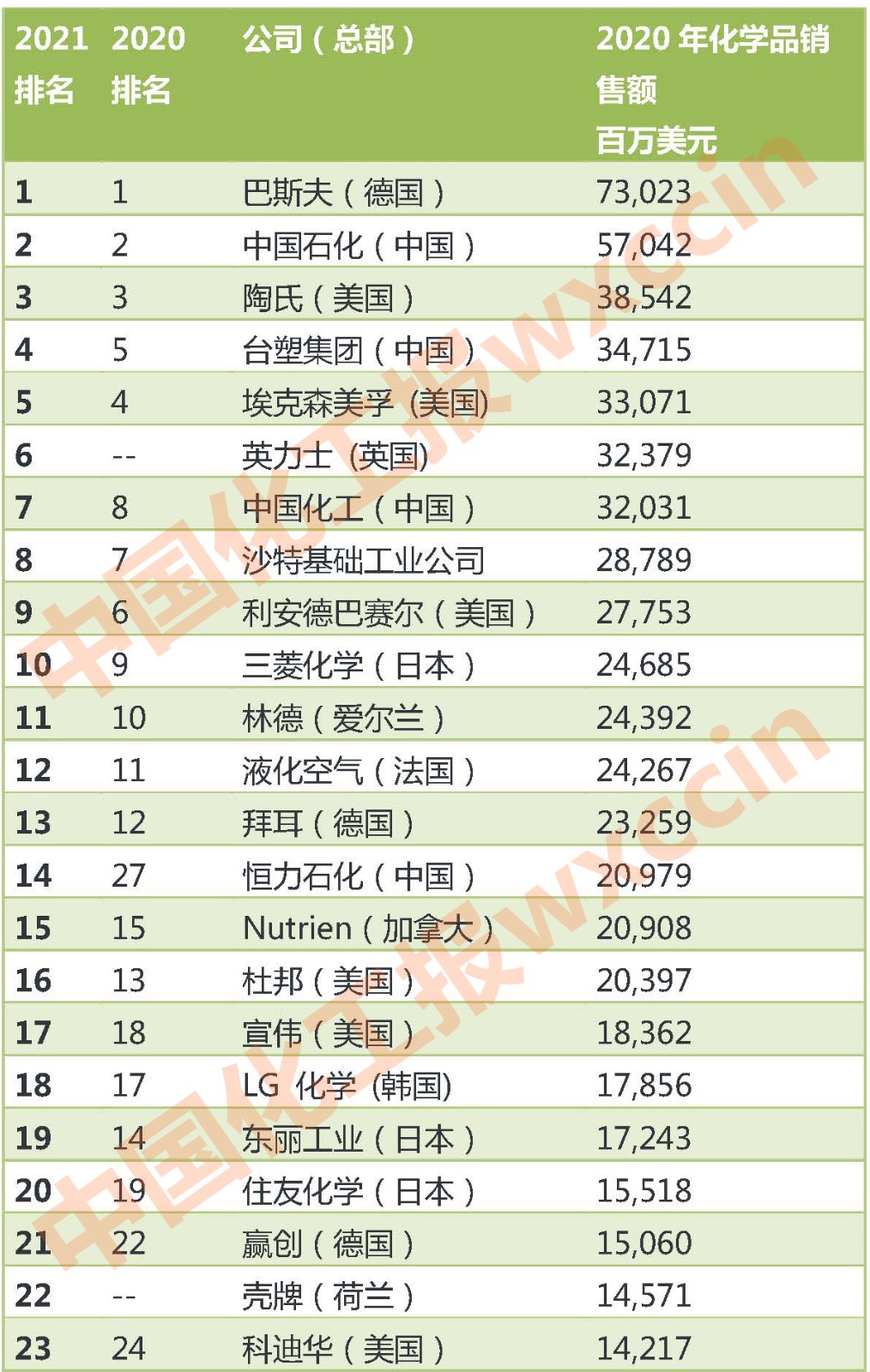 已有人閱讀此文 - -9月13日,美國《化學周刊》發(fā)布了最新全球化工公司十億美元俱樂部排名。按2020年銷售收入計,巴斯夫蟬聯(lián)榜首,中國石化仍位居第二,陶氏化學名列第三。