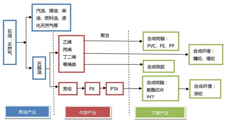 石油化工則是在煉制的基礎上,以煉油過程提供的原料進一步化學加工獲得化工產品。主要以石腦油(又叫化工輕油)為重整和化工原料,制作中游產品,中游產品又主要分為兩大類,一類烯烴(包括乙烯、丙烯、丁烯、丁二烯等),另一類是芳烴(苯、甲苯、二甲苯等),再對這些為原料進行有機合成,會得到諸如塑料、化纖、滌綸、橡膠、合成樹脂一類的下游產品。