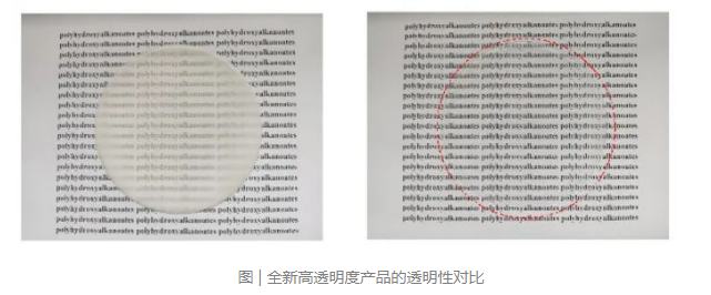 左圖是普通生物降解材料,透明性較差,可模糊看到下面的文字;右圖是新型透明P(53% 3HB-co-20% 4HB-co-27% 5HV)材料,可以清晰看到下面文字。