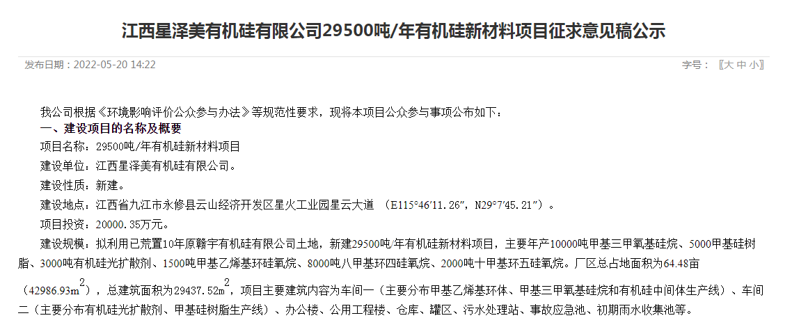 5月20日,江西星澤美有機硅有限公司對擬新建的2.95萬噸/年有機硅新材料項目進行了公示。