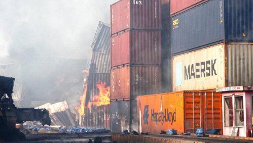 一個(gè)存放雙氧水的集裝箱起火,而后延燒到存放硫磺和其他化學(xué)品的集裝箱,引發(fā)多次爆炸。4公里之外都能感受到爆炸發(fā)生,集裝箱堆場(chǎng)周圍建筑的玻璃被震碎。