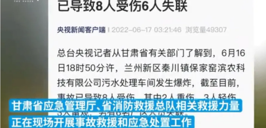 6月16日下午18時,蘭州新區秦川鎮保家窯濱農科技有限公司污水處理車間發生爆炸。事故造成8人受傷,其中2人重傷,3人輕傷,3人留觀,6名電廠人員失去聯系。 事故發生后,甘肅省應...