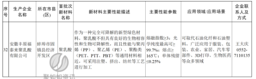 安徽豐原福泰來聚乳酸入選安徽省首批新材料推廣應用指導目錄