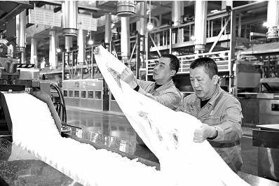 合成纖維一部員工檢查滌綸短纖維質(zhì)量