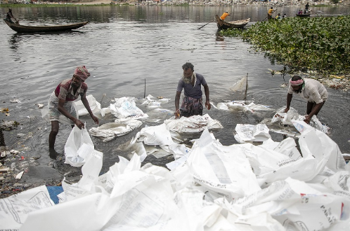 孟加拉國達卡附近的布里甘加河受到嚴重污染,工人們打撈了大量塑料廢料進行回收。