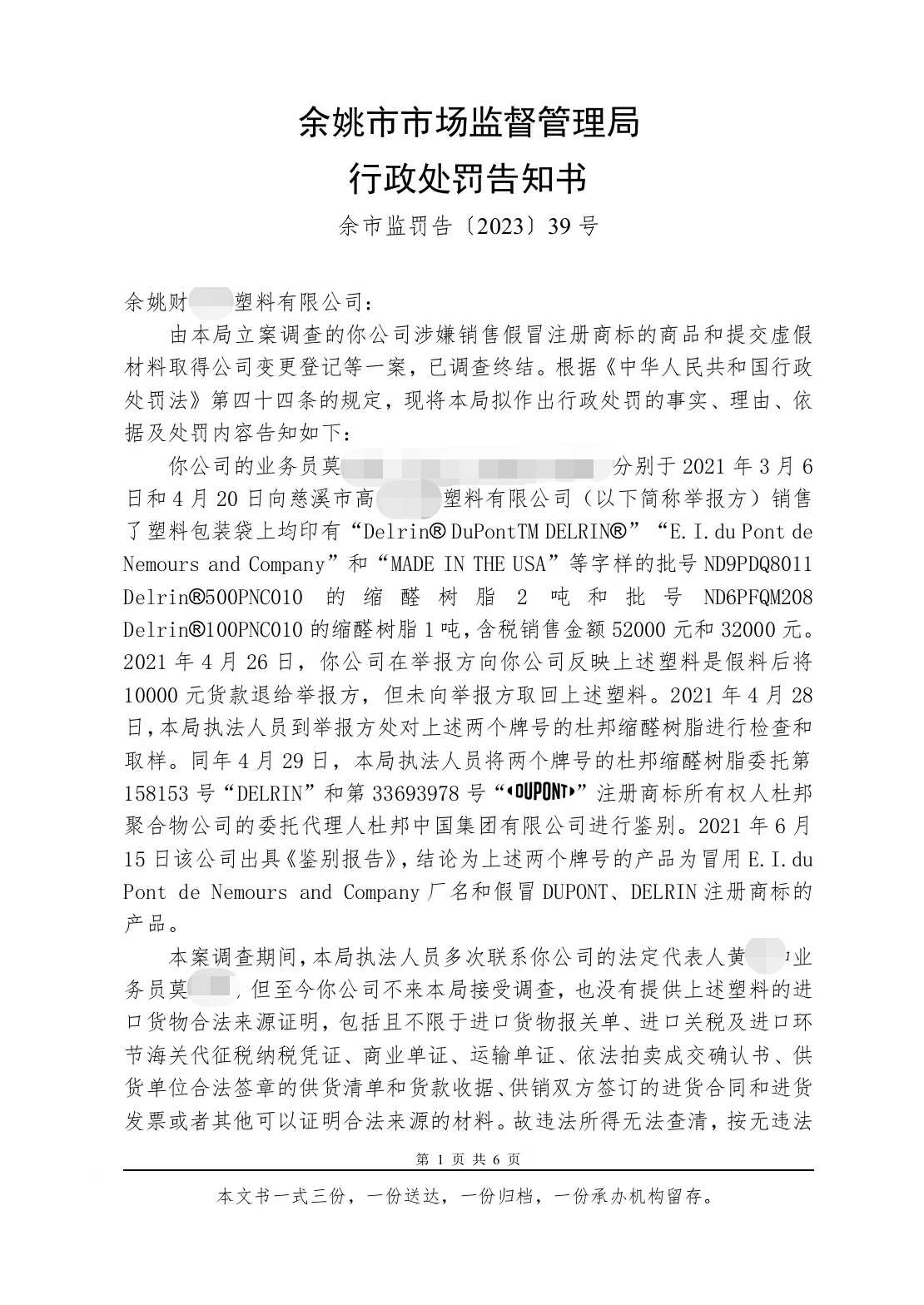 近日,余姚市市場監(jiān)管局鳳山所根據(jù)舉報查處一起銷售假冒杜邦塑料案,對拒不配合調(diào)查取證的余姚某塑料公司作出了罰款40萬元的重罰。