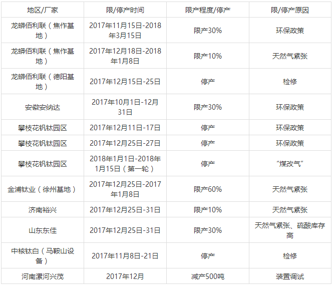 已有人閱讀此文 - -進到冬天后,更加嚴苛的環保政策讓鈦白粉領域真實感受到寒冷,一部分生產廠家也是因“煤改電”后燃氣供貨焦慮不安而迫不得已限產,可以說始料不及。近三個月來限產停產的信息替代了原來“漲價通知函”,變成領域內經常出現的新聞報道。據隆眾資訊不徹底統計分析,三個月誘因“限產停產”的危害,生產量約降低4.八萬噸。