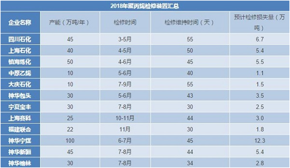 據(jù)中宇數(shù)據(jù)分析,到目前為止2018裝置預(yù)估檢修裝置歸納以下。2018裝置集中化檢修季集中化在4-五月及其7-八月份,年誘因裝置檢修導(dǎo)致的聚丙烯損失率現(xiàn)階段統(tǒng)計(jì)分析在51萬(wàn)噸級(jí)上下。