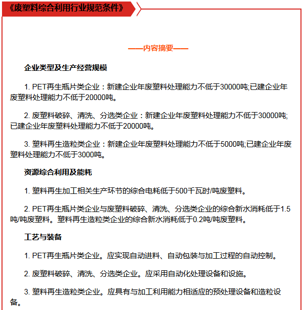 為規范廢塑料資源綜合利用行業發展紀律,推動公司提升升級,提升資源綜合利用技術性和管理能力,正確引導領域身心健康不斷發展趨勢,工信部于二零一五年12月4日制訂了《廢塑料綜合利用行業規范條件》、《廢塑料綜合利用行業規范條件公告管理暫行辦法》。