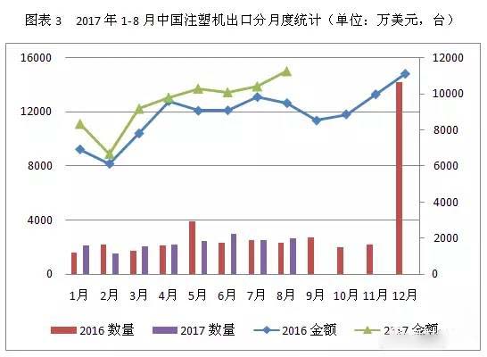 海關統計數據信息顯示信息,17年1-八月,我國塑料機進口額度為54838萬美金,環比升高44.6%;進口5124臺,同比增長率42%;出入口額度為75904萬美金,環比升高11.9%;出入口18335臺,同比減少1.4%。