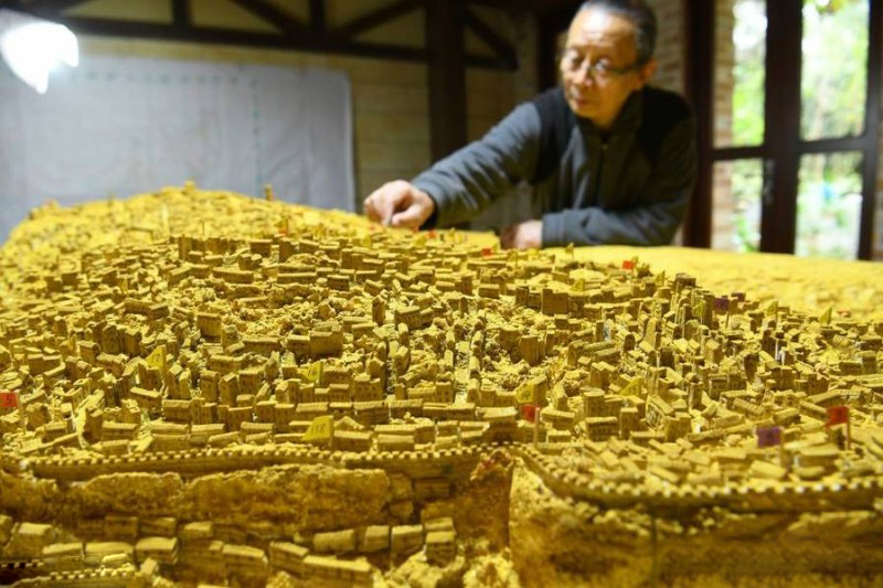 17年11月11日,重慶市73歲的張更之老人利用兩米寬3米長的泡沫塑料雕刻了一座老重慶城。張更之說,是2件事使他出芽了制做一個老重慶城沙盤的想法。一件是他見到一部紀實片詳細介紹德國漢堡市的實體模型歷史博物館;另一件是參觀考察了老重慶十八梯國際電影節。老重慶城沙盤上標明了133條街道社區、30處港口、32處名舍名址。圖為老人用雕刻工具在沙盤上開展裝飾。