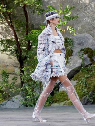 全透明塑料材料的各種各樣防水防雨武器裝備,變成下一季服裝系列產品的主角。模特衣著全透明兩色靴子,兩腿清楚可見,代表性的香奈兒外套,罩上菏葉收口的全透明塑料披風斗篷,多層面的差距,構建出清爽的視覺沖擊。大衣、膠手套、遮陽帽、包包等都是有專用型塑料“雨披”。