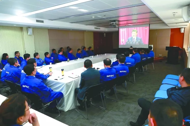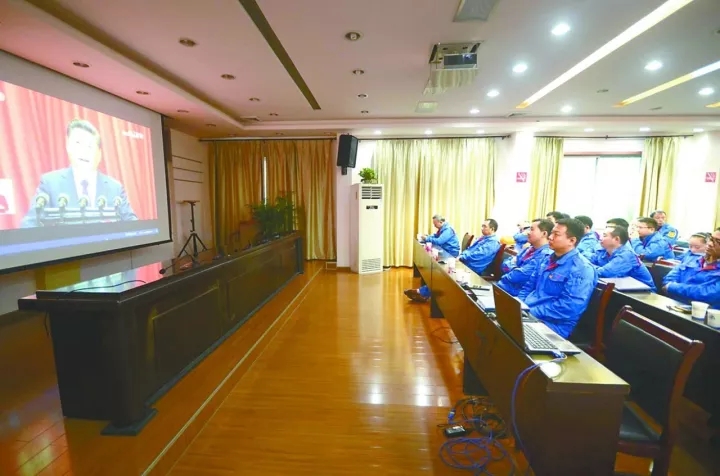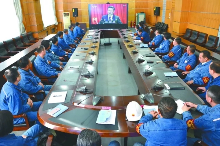 陜西省未來新能源化工公司分六個主會場,另外充分利用網絡、app客戶端等,總共機構六百七十余人集中化收看接聽十九大開幕會直播間,占該企業在籍總人數的百分之三十五。圖為收看現場直播。