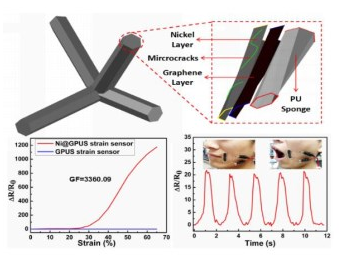 該精英團隊組員韓飛和張國平副研究員等運用聚氨酯海綿,歷經多次吸咐復原全過程制取導電率優良的石墨烯材料包覆聚氨酯海綿,隨后根據電堆積方式 ,在其表層包覆一層含有微裂痕的金屬鎳,最終運用柔性高聚物封裝方法制取出了鎳/石墨烯材料包覆的聚氨酯海綿柔性應變傳感器。
