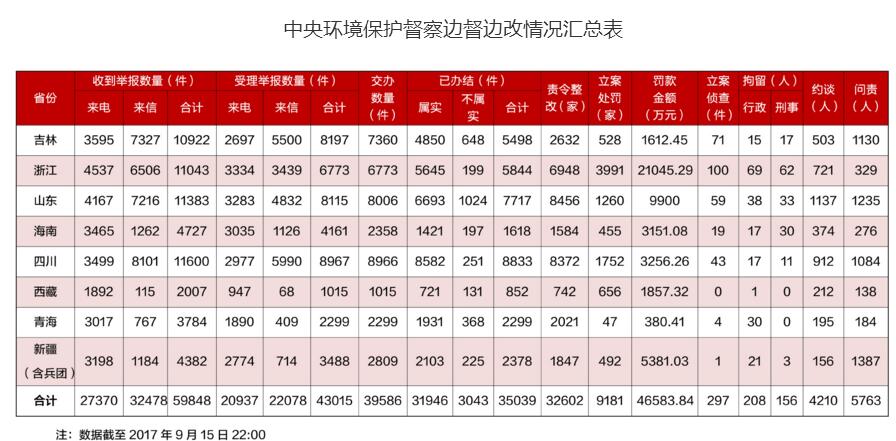 截止2017年9月15日,督察組督辦的自然環(huán)境舉報(bào),地區(qū)已受理35039件,受理率做到88.5%。在其中,勒令整改32602家;立案?jìng)刹閼土P9181家,處罰46583.84萬(wàn)余元;立案調(diào)查297件,行政部門和刑拘364人;提醒談話4210人,責(zé)任追究576三人。