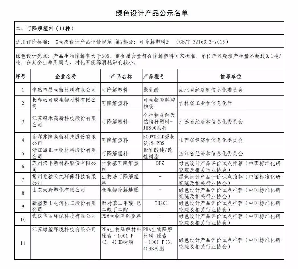 在其中有11款可降解塑料當選綠色設計商品公示公告名單,各自由孝感市易得新型材料有限公司、長春市必可成生物技術有限公司、江蘇省錦禾創新科技股份有限公司、金暉兆隆創新科技股份有限公司、浙江海正生物技術股份有限公司、蘇州市漢豐新型材料股份有限公司、常州市龍駿天純環保技術有限公司、山東省天野熔融有限公司、新疆省藍山屯河化工廠股份有限公司、武漢市綺麗環保技術有限公司、江蘇省綠塑環境科技有限公司生產制造。