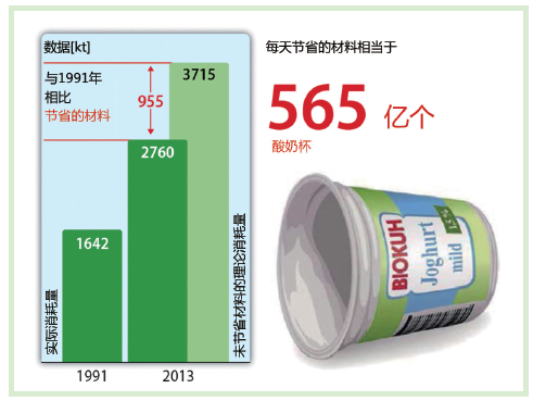 據德國圣埃蒂安的市場調查企業GVM估計,1991-2013年間,生產制造同樣總數的包裝需要的塑料比以前少了一百萬噸,等同于每日節省5.65億次酸奶杯(圖2)。
