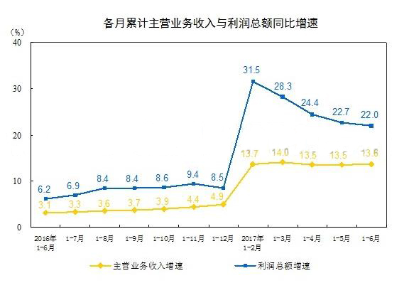 據中國統計局工業生產司何平博士講解表明,2017年6月份,中國規模以上制造業企業盈利同比增長19.1%,增長速度比5月份加快2.4個點;上半年度,盈利同比增長22%,增長速度比1-5月份變緩0.七個點。