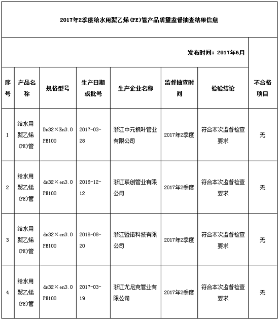 7月25日,紹興市質監局官方網站發布2017年二季度紹興市給水用聚乙烯(PE)管產品地市級監管抽查結果,各地各部門抽查了諸暨市4家公司的4批號給水用聚乙烯(PE)管產品,不過關0批號。